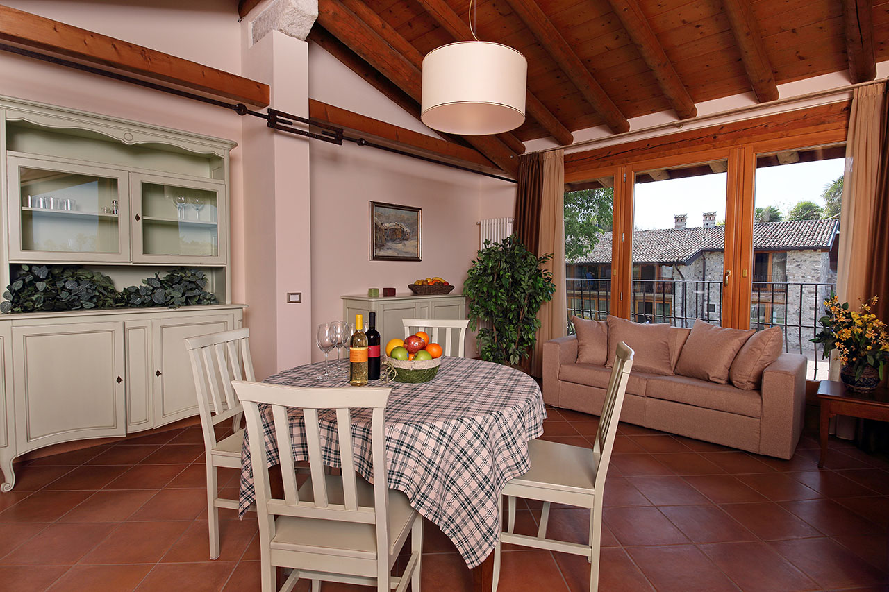 Soggiorno, divano letto doppio, angolo cottura, 1 camera doppia, 1 bagno con doccia e bidet. Al primo o secondo piano, uno si sviluppa su due piani. Senza balcone o terrazza.